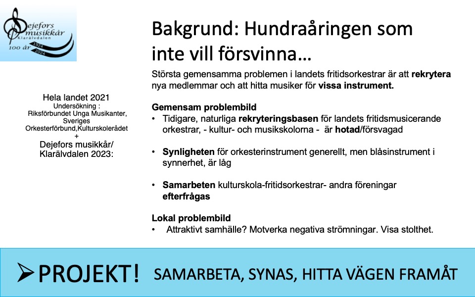 Gruvöns och Dejefors musikkårer, ett samarbete som har sporadiskt pågått sedan några år tillbaka, i första hand vid behov av förstärkning av musiker. Orkestrarna delar de största utmaningarna inför framtiden: dirigentskap och nyrekrytering av musiker. Samarbetet behöver byta fokus, från att ”rycka in” när plötsliga behov uppstår, till att samarbeta med sikte på framtiden. Gruvöns musikkår kommer att delta i projektets aktiviteter, Dejefors musikkår kommer att delta i konserter i Grums. Målet var att samarbetet skulle skapa extra uppmärksamhet och engagerar fler även i Grums, en förhoppning som infriades då jubileumskonserten i Grums Folkets lockade tre gånger så stor publik än tidigare konserter.