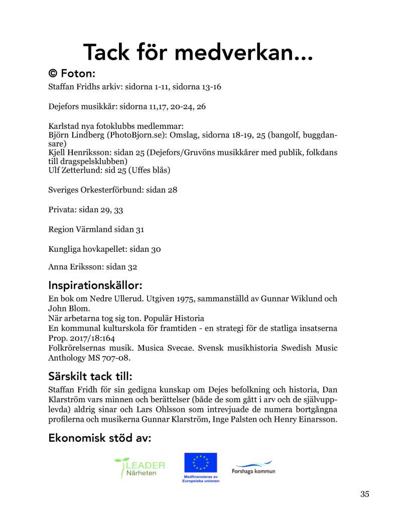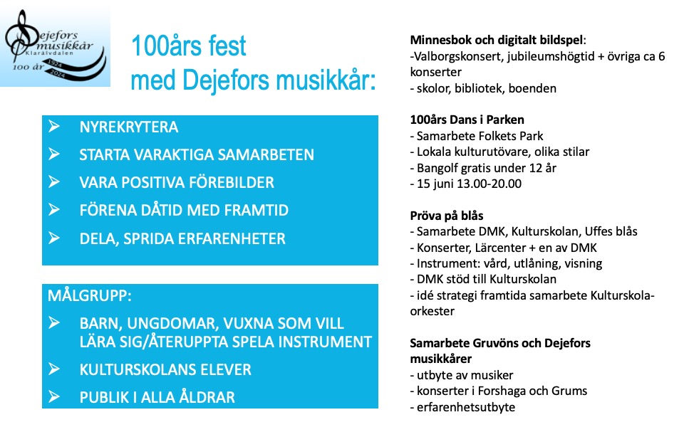 Tillsammans med Folkets Park, Forshaga, Kulturskolan/Forshaga kommun, Uffes Blås och Gruvöns musikkår har vi firat att Dejefors musikkår fyllde hundra år. Vi fick stöd av EU-Leader Närheten till en bok, jubileumskonsert, ett dansevenemang, ”prova på blås”-aktiviteter och för att hitta en handlingsplan för framtida samarbeten.