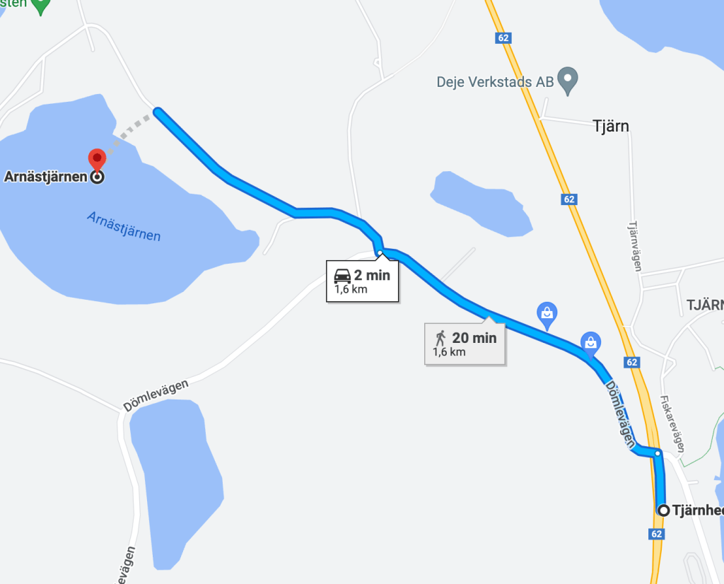 Från Riksväg 62 vid Bytespunkt Tjärnheden: Mot Dömle. Första avtagsvägen till höger (mot badplatserna) välj Arnäs.